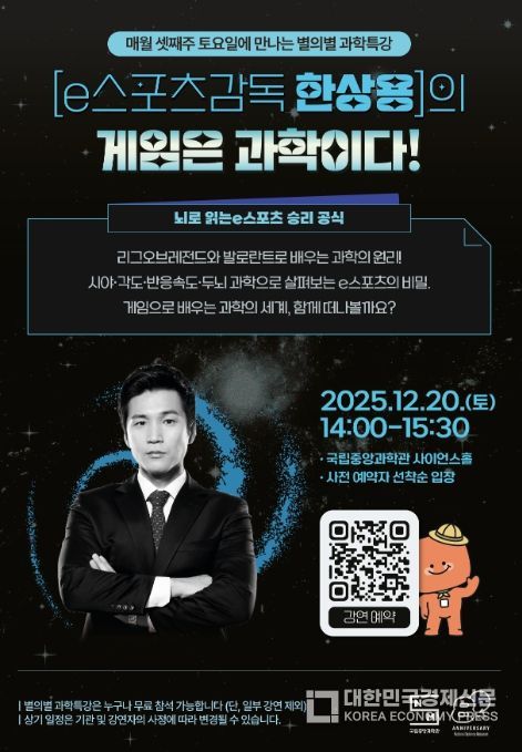 [대한민국경제신문] 과학기술정보통신부 국립중앙과학관은 12월 20일 오후 2시, 매월 셋째 주 토요일에 열리는 ‘별의별 과학특강’의 12월 강연자로 오산대학교 e스포츠학과 한상용 교수를 초청해 '게임은 과학이다'라는 주제의 강연을 개최한다고 밝혔다.