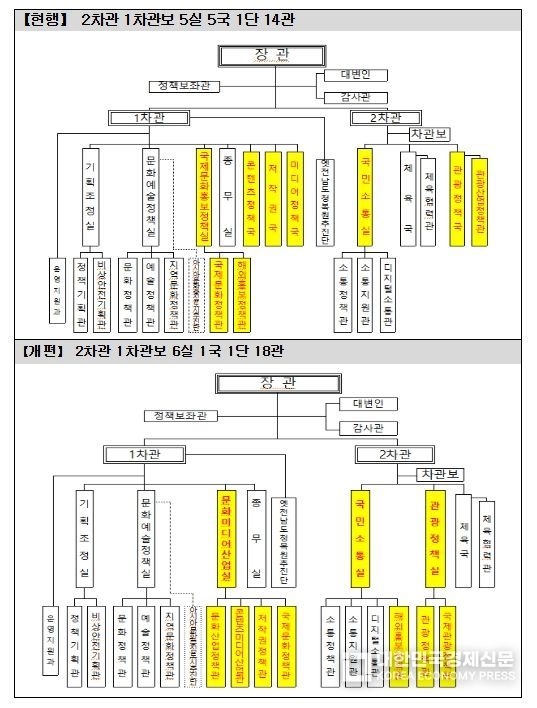 ‘문화미디어산업실’ 내의 콘텐츠정책국과 미디어정책국을 개편해 ‘지식재산(IP)-인력-자금-연구개발(R&D)’ 등 콘텐츠산업의 4대 성장 기반을 중점적으로 지원하는 문화산업정책관을 두고, 미디어·영화·게임·대중음악·출판 등 핵심 분야 지원 기능은 ‘콘텐츠미디어산업관’으로 일원화해 개별 산업 내 쟁점에 대해서도 신속히 대응할 계획이다.