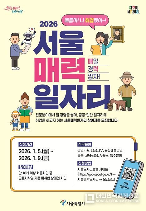 [대한민국경제신문] 서울시는 직무교육과 실제 일 경험을 통해 민간 취업으로 연계하는 대표 디딤돌 일자리 사업인 ‘서울 매력일자리’를 2026년 총 3,600명 규모로 확대 운영한다.