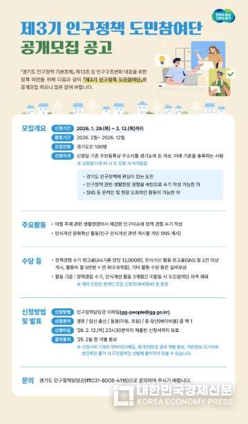 [대한민국경제신문] 경기도가 정책 대상자가 직접 정책개선에 참여하는 ‘제3기 인구정책 도민참여단’ 100명을 공개 모집한다.