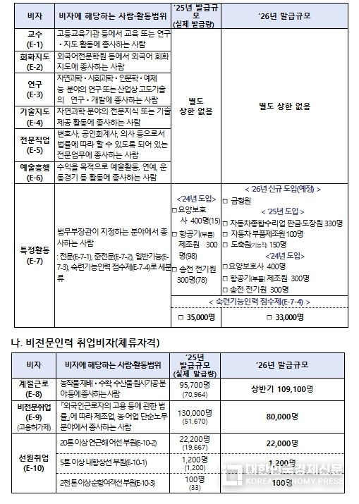 [대한민국경제신문] 법무부는 외국인 유입이 지역경제와 국민 일자리에 미치는 영향을 종합적으로 분석한 결과를 바탕으로, 관계부처와의 협의를 거쳐 2026년 연간 비자 발급규모를 공표했다.