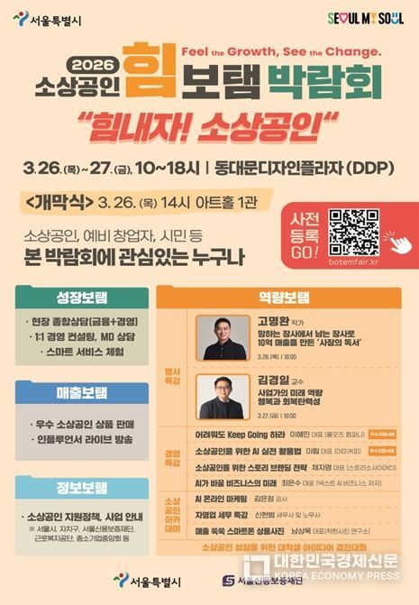 [대한민국경제신문] 서울시와 서울신용보증재단은 3월 26일부터 27일까지 이틀간 동대문디자인플라자(DDP)에서 ‘2026 소상공인 힘보탬 박람회’를 개최한다. 서울시 첫 소상공인 종합박람회로 금융·판로·교육 등 소상공인에게 필요한 정책과 정보를 총망라한 체험형 행사다.