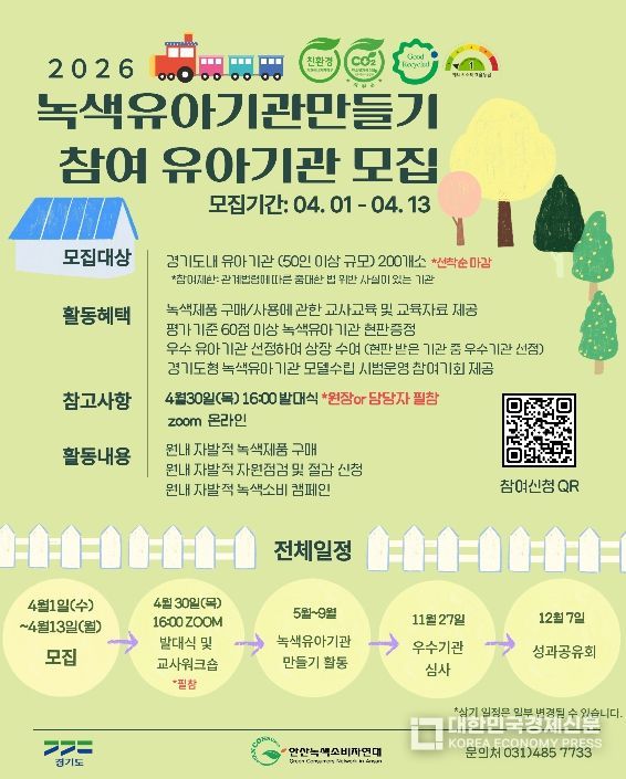 [대한민국경제신문] 경기도가 아이들이 생활 속에서 올바른 녹색 소비 습관을 가질 수 있도록 돕는 ‘2026년 녹색유아기관만들기’ 참여 기관 200곳을 4월 13일까지 모집한다.