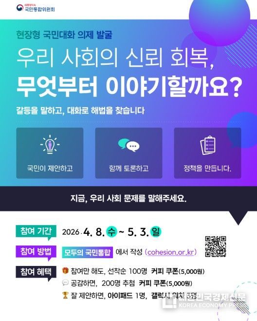 [대한민국경제신문] 대통령직속 국민통합위원회는 올해부터 새롭게 추진하는 '현장형 국민대화'의 온라인 소통 창구인 ‘모두의 국민통합’ 을 4월 8일 10시에 개통하고, 국민통합을 향한 대화에 나선다.