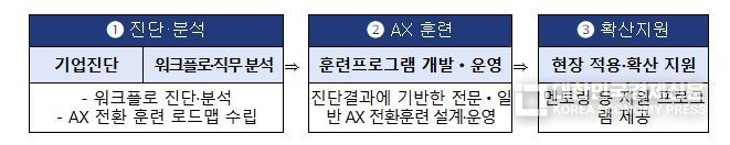 ② 2단계(훈련): 대표이사(CEO) 대상의 인사이트 교육(일반AX)과 실무자 중심의 문제해결형 교육(전문AX)을 병행한다. 실무 훈련은 최소 18시간 이상의 실습 위주로 구성된다.