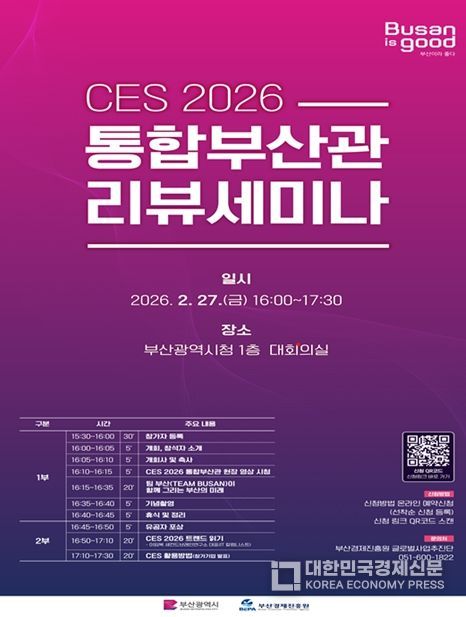 [대한민국경제신문] 부산시는 오늘(27일) 오후 4시 시청 대회의실에서 'CES 2026 통합부산관' 리뷰 세미나를 개최한다고 밝혔다.