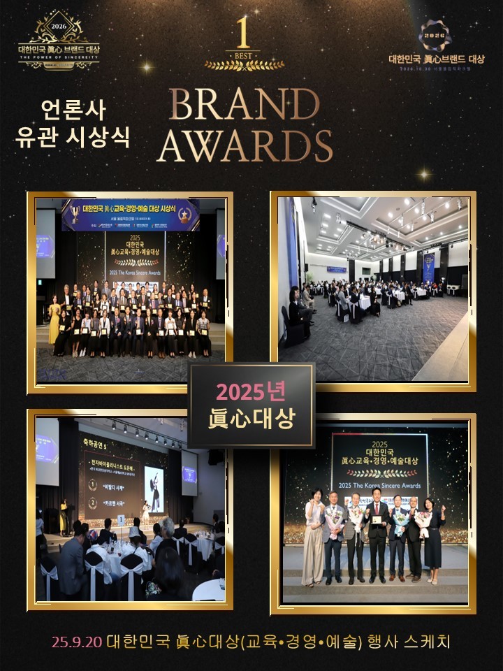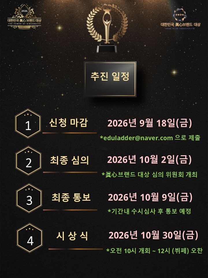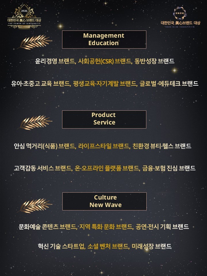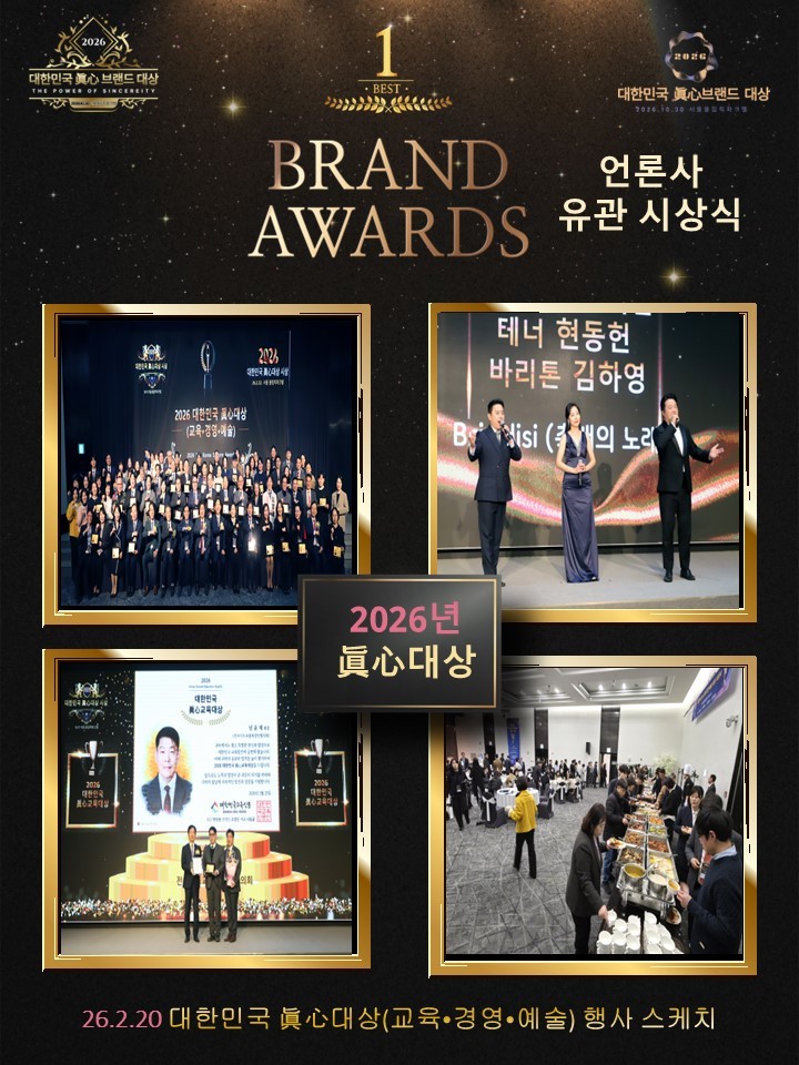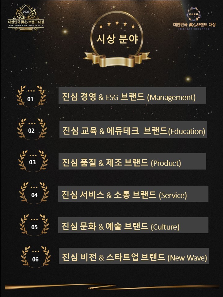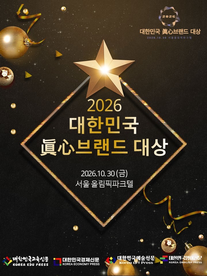 대한민국경제신문은 교육·예술·영어·학원신문과 함께 마음을 움직이는 힘인 ‘진심’의 가치를 실천해온 브랜드를 발굴하고 격려하기 위해 2026년 10월 30일 금요일 ‘2026 대한민국 眞心(진심) 브랜드 대상’ 수상 후보를 공모한다.