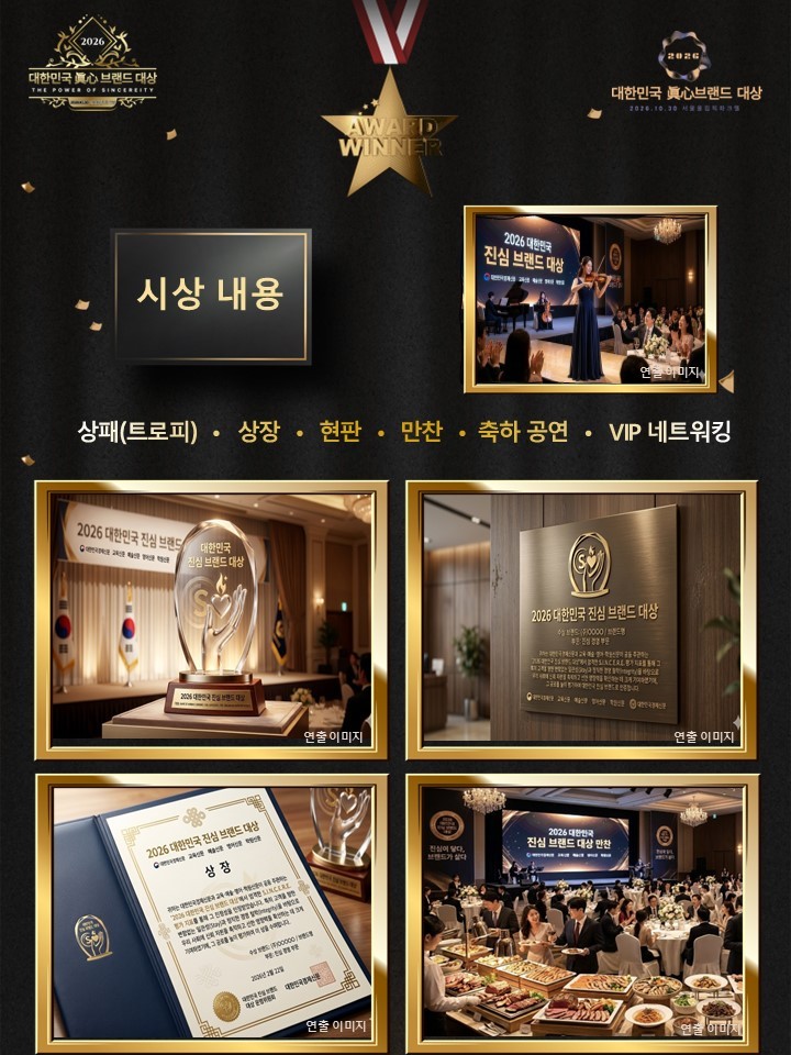 ■ 수상자 특전 및 시상식 일정 수상사에는 공식 상패(트로피)와 상장, 인증 현판이 수여된다. 또한 시상식 당일 전문가 축하 공연과 함께하는 만찬(뷔페) 및 VIP 네트워킹 기회가 제공되어 수상자 간의 활발한 교류를 지원할 예정이다. 수상 내용은 언론 보도와 온라인 매체 광고 등을 통해 브랜드 인지도와 신뢰도를 높이는 데 적극 활용될 수 있다.