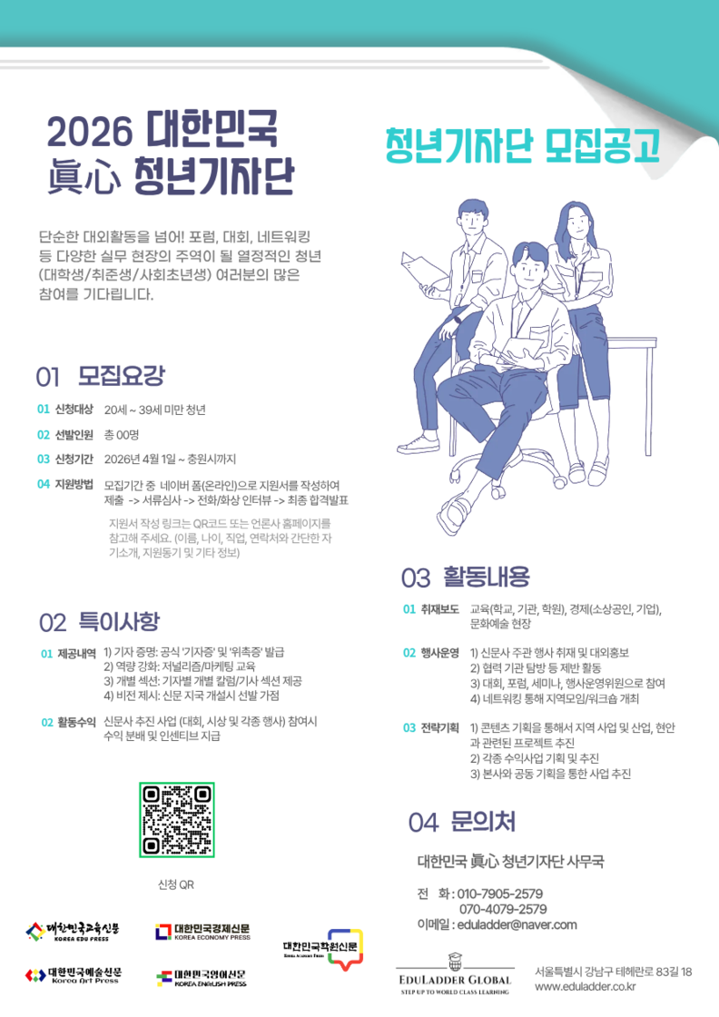 대한민국 교육과 경제, 문화예술의 미래를 써 내려갈 젊은 시선을 찾는다. 대한민국교육신문, 대한민국경제신문, 대한민국예술신문 등 주요 언론사가 연합하여 지역 사회의 생생한 현장을 발굴하고 새로운 콘텐츠의 지평을 열어갈 ‘2026 대한민국 眞心 청년기자단'을 모집한다.