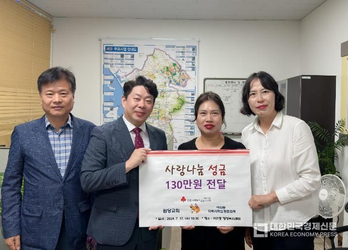 대한민국경제신문 관리자 기자 | 검단신도시 아라동 소재 원당교회는 지난 17일 아라동행정복지센터에 사랑나눔 기탁금 1,300천원을 전달했다.