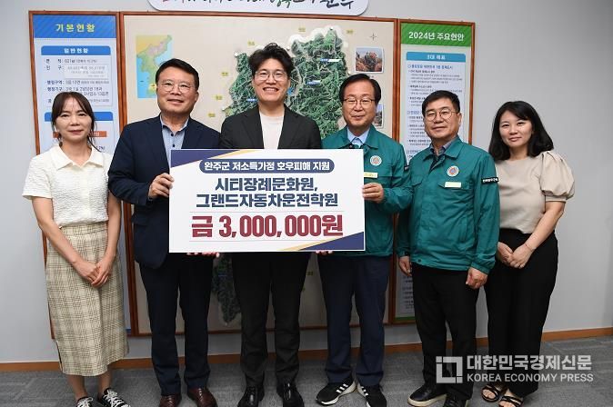 대한민국경제신문 관리자 기자 | 시티장례문화원, 그랜드자동차 운전학원이 완주군 저소득층 및 호우피해가정을 위해 성금 300만 원을 전달했다.
